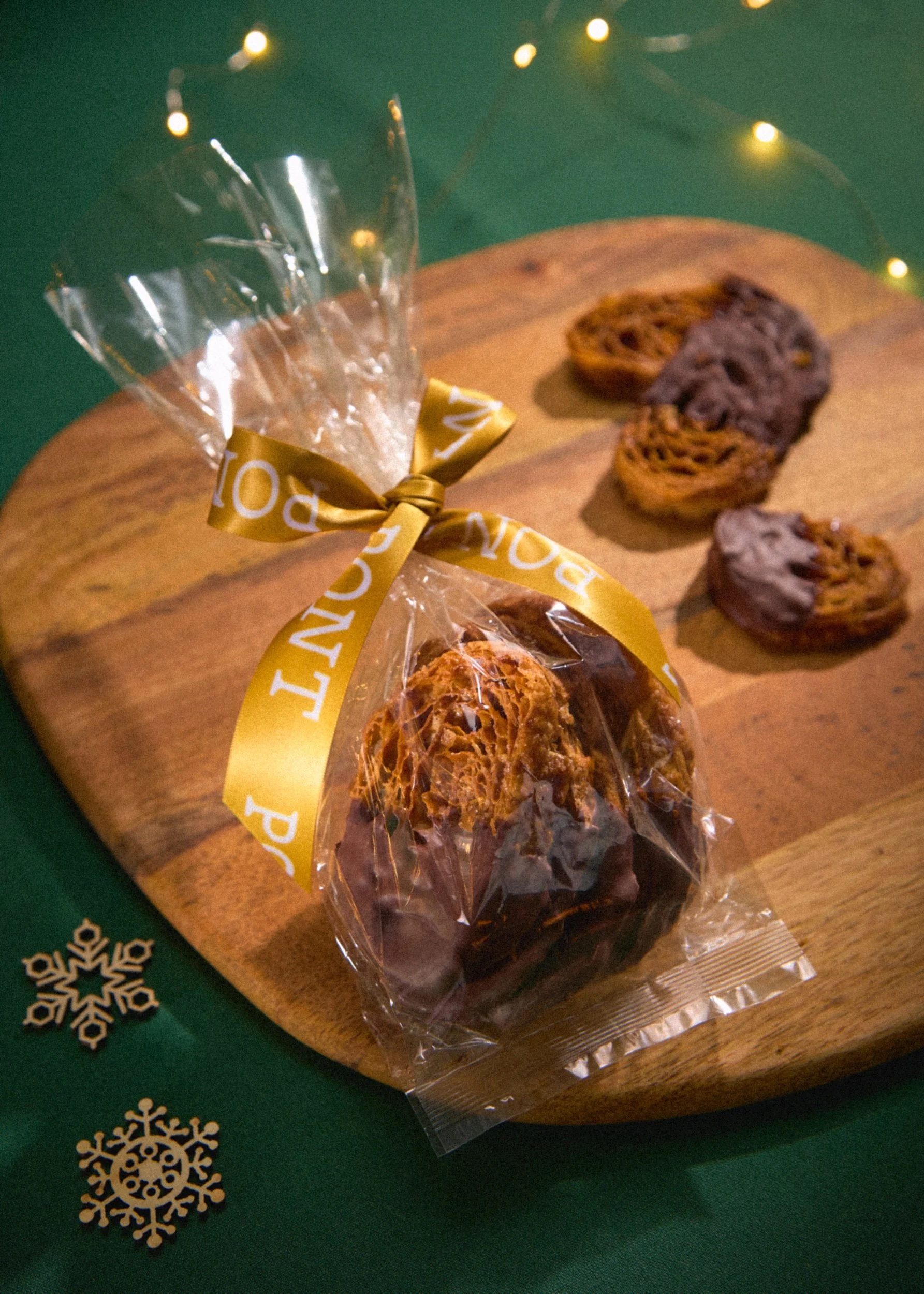 Thinly sliced pieces of our croissants, dipped in a mix of cream and sugar and caramelised until sweet and crispy, and dipped into chocolate once cooled. So moreish.